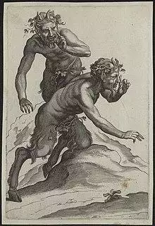 In the 1560 Geneva Bible, the word sa’ir in both of the instances in Isaiah is translated into English as "satyr".[110] The 1611 King James Version follows this translation and likewise renders sa’ir as "satyr".[111] Edwards states that the King James Version's translation of this phrase and others like it was intended to reduce the strangeness and unfamiliarity of the creatures described in the original Hebrew text by rendering them as names of familiar entities.[112] Edmund Spenser refers to a group of woodland creatures as Satyrs in his epic poem The Faerie Queene. In Canto VI, Una is wandering through the forest when she stumbles upon a "troupe of Fauns and Satyrs far away Within the wood were dancing in a round." Although Satyrs are often negatively characterized in Greek and Roman mythology, the Satyrs in this poem are docile, helpful creatures. This is evident by the way they help protect Una from Sansloy. Sylvanus, the leader, and the rest of the Satyrs become enamored by Una's beauty and begin to worship her as if she is a deity.[113] However, the Satyrs prove to be simple minded creatures because they begin to worship the donkey she was riding.