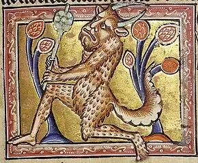 Medieval storytellers in Western Europe also frequently conflated satyrs with wild men.[93][97] Both satyrs and wild men were conceived as part human and part animal[98] and both were believed to possess unrestrained sexual appetites.[98] Stories of wild men during the Middle Ages often had an erotic tone[98] and were primarily told orally by peasants, since the clergy officially disapproved of them.[98] In this form, satyrs are sometimes described and represented in medieval bestiaries,[99][100] where a satyr is often shown dressed in an animal skin, carrying a club and a serpent.[93] In the Aberdeen Bestiary, the Ashmole Bestiary, and MS Harley 3244, a satyr is shown as a nude man holding a wand resembling a jester's club and leaning back, crossing his legs.[92] Satyrs are sometimes juxtaposed with apes, which are characterized as "physically disgusting and akin to the Devil".[93] In other cases, satyrs are usually shown nude, with enlarged phalli to emphasize their sexual nature.[101] In the Second-Family Bestiary, the name "satyr" is used as the name of a species of ape, which is described as having a "very agreeable face, restless, however, in its twitching movements."[102]