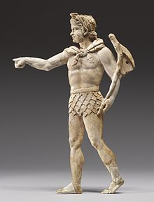 Rather than appearing en masse as in satyr-plays, when satyrs appear in myths it is usually in the form of a single, famous character.[62] The comic playwright Melanippides of Melos (c. 480–430 BC) tells the story in his lost comedy Marsyas of how, after inventing the aulos, the goddess Athena looked in the mirror while she was playing it.[61] She saw how blowing into it puffed up her cheeks and made her look silly, so she threw the aulos away and cursed it so that whoever picked it up would meet an awful death.[61] The aulos was picked up by the satyr Marsyas,[61] who challenged Apollo to a musical contest.[62] They both agreed beforehand that whoever won would be allowed to do whatever he wanted to the loser.[62] Marsyas played the aulos and Apollo played the lyre.[62] Apollo turned his lyre upside-down and played it.[62] He asked Marsyas to do the same with his instrument.[62] Since he could not, Apollo was deemed to victor.[62] Apollo hung Marsyas from a pine tree and flayed him alive to punish him for his hubris in daring to challenge one of the gods.[62] Later, this story became accepted as canonical[61] and the Athenian sculptor Myron created a group of bronze sculptures based on it, which was installed before the western front of the Parthenon in around 440 BC.[61] Surviving retellings of the legend are found in the Library of Pseudo-Apollodorus, Pausanias's Guide to Greece, and the Fabulae of Pseudo-Hyginus.[64][62]