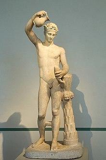 The Athenian sculptor Praxiteles's statue Pouring Satyr represented the eponymous satyr as very human-like.[73][74] The satyr was shown as very young, in line with Praxiteles's frequent agenda of representing deities and other figures as adolescents.[75] This tendency is also attested in the descriptions of his sculptures of Dionysus and the Archer Eros written in the third or fourth century AD by the art critic Callistratus.[75] The original statue is widely assumed to have depicted the satyr in the act of pouring an oinochoe over his head into a cup, probably a kantharos.[76][74] Antonio Corso describes the satyr in this sculpture as a "gentle youth" and "a precious and gentle being" with "soft and velvety" skin.[77] The only hints at his "feral nature" were his ears, which were slightly pointed, and his small tail.[74][77]
