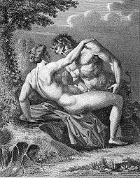 The etymology of the name satyr (Greek: σάτυρος, sátyros) is unclear, and several different etymologies have been proposed for it,[5] including a possible Pre-Greek origin.[6] Some scholars have linked the second part of name to the root of the Greek word θηρίον (thēríon), meaning "wild animal".[5] This proposal may be supported by the fact that Euripides at one point refers to satyrs as theres.[5] Another proposed etymology derives the name from an ancient Peloponnesian word meaning "the full ones", alluding to their permanent state of sexual arousal.[5] Eric Partridge suggested that the name may be related to the root sat-, meaning "to sow", which has also been proposed as the root of the name of the Roman god Saturn.[5] Satyrs are usually indistinguishable from silenoi, whose iconography is virtually identical.[7][8][9] According to Brewer's Dictionary of Phrase and Fable, the name "satyr" is sometimes derogatorily applied to a "brutish or lustful man".[10] The term satyriasis refers to a medical condition in males characterized by excessive sexual desire.[10][11] It is the male equivalent of nymphomania.[11]