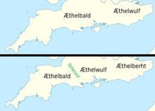 At the beginning of the ninth century, England was almost wholly under the control of the Anglo-Saxons, and the Midland kingdom of Mercia dominated southern England. In 825 Ecgberht decisively defeated the Mercians at the Battle of Ellendun, ending Mercian supremacy. The two kingdoms became allies, which was important in the resistance to Viking attacks.[3] In 835 the Isle of Sheppey in Kent was ravaged. In 836 Ecgberht was defeated by the Vikings at Carhampton in Somerset, but in 838 he was victorious over an alliance of Cornishmen and Vikings at the Battle of Hingston Down, reducing Cornwall to the status of a client kingdom.[4] He died in the following year and was succeeded by his son Æthelwulf, who appointed his eldest son Æthelstan as sub-king of Kent, Essex, Surrey and Sussex, in the same year.[5]