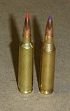 The .243 Winchester (6×52mm) is a popular sporting rifle cartridge. Initially designed as a target/varmint round, it may be used for animals such as coyotes, blacktail deer, whitetail deer, mule deer, pronghorns, and wild hogs. Rounds of at least 90 grains are better suited for hunting the larger of those while rounds less than 90 grains are more suitable for varmints.[3] The .243 is based on a necked down .308 cartridge case. It is very popular with target shooters, metallic silhouette, and long range shooters, because of its accuracy and low recoil.