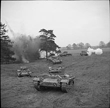 The regiment was posted to Flug Marine Barracks in Schleswig at the end of the war but moved to Lulworth Camp in late 1946.[3] Princess Elizabeth became Colonel-in-Chief of the regiment in 1947, and after her accession to the throne, the regiment was retitled the 16th/5th The Queen's Royal Lancers, in 1954.[4] The regiment was deployed to Egypt in March 1948 and to Libya in February 1950.[3] It re-roled as an anti-tank regiment with 33rd Armoured Brigade based Athlone Barracks in Sennelager in July 1953 before moving to Waithwith Camp at Catterick Garrison in February 1957.[3] It joined 12th Infantry Brigade and moved to Imphal Barracks in Osnabrück in April 1959.[3]