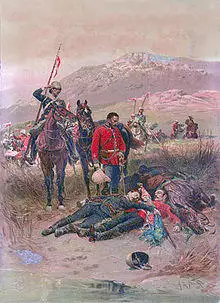 In February 1900 a contingent from the regiment, comprising Lieutenant-Colonel E. F. Herbert and 500 troops, was deployed to South Africa for service in the Second Boer War,[47] and arrived to Cape Town on the SS Victorian early the next month.[48] The contingent missed the large pitched battles, but still saw action during the war. In 1900, Sergeant Brian Lawrence won the regiment's fifth and final Victoria Cross at Essenbosch Farm.[49] The contingent's most significant action was at the Battle of Elands River (Modderfontein) in September 1901. C Squadron was attacked by a unit of Boers under the command of Jan Smuts; the Lancers mistakenly assumed the unit was friendly because of their attire.[50] The Boers immediately opened fire, attacking from both the front and the rear. The Lancers suffered further casualties at a closed gate that slowed them down. Only Captain Sandeman, the squadron commander, and Lieutenant Lord Vivian survived. The regiment suffered 29 killed and 41 wounded before surrendering, while Boer losses were just one killed and six wounded.[51]