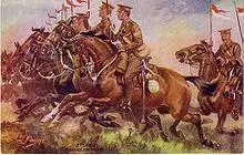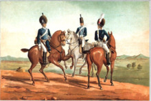 The regiment was sent to India shortly after returning home.[29] It took part in the attack on the Pindarees in 1817 during the Third Anglo-Maratha War.[30] Disease ravaged the regiment during its residency.[31] While in India, the British Army nominally re-classified the regiment as lancers,[32] and added "lancers" as a subtitle to its regimental designation in 1822.[2][3] The regiment did not learn of its new status until 1823, when, during a stopover at Saint Helena on its journey back to Britain, a copy of the Army List was obtained.[32] Although the weapon's use had endured in parts of continental Europe,[33] the lance had not been in British service for more than a century.[34] Its reintroduction by the Duke of York, Commander-in-Chief of the British Army, owed much to the performance of Napoleon Bonaparte's Polish Uhlans.[35] The lancer regiments adopted their own version of the Uhlan uniform, including the czapka-style headdress.[36]