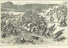 The regiment was sent to Natal Colony for service in the Anglo-Zulu War and fought at the Battle of Ulundi under Sir Drury Curzon Drury-Lowe in July 1879.[45] The regiment was deployed inside a large British infantry square during the attack by the Zulu Army, which had surrounded the British.[45] When the attack appeared to be wavering, the regiment was ordered to advance: their charge routed the warriors with heavy loss and proved to be decisive.[45] The regiment returned to India the same year, remaining there until about 1890 when they returned to England.[45]