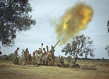 The Headquarters (HQ) of 1st AGRA was formed at Hamilton Park, Glasgow, on 24 August 1942.[8][9][10] It was assigned to First Army for the landings in North Africa (Operation Torch), and arrived in Tunisia in January 1943, together with 56th Heavy Regiment, equipped with 7.2-inch howitzers – the first heavy regiment of the RA to serve overseas since the Dunkirk evacuation in 1940. 1st AGRA went into action in February in support of XIX French Corps with one heavy, three medium and three field regiments under command. Later it supported V Corps in the closing stages of the campaign.[9][6] It then prepared for the Allied invasion of Italy.