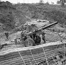 Both 1st and 6th AGRAs supported XIII Corps in July 1944 as it approached the Gothic Line. This time the front was so wide that control of the medium guns had to be decentralised to the individual divisions, so the two AGRAs only retained two medium regiments in addition to their two heavy regiments.[13] However, when the 2nd New Zealand Division attacked on 29 July, it was supported by a concentration including the field artillery of 6th South African Armoured and 8th Indian Divisions as well as 1st AGRA, which was responsible for coordinating CB fire.[14] 1st AGRA was assigned to V Corps for the assault on the Gothic Line (Operation Olive) in August 1944, and remained with it for the rest of the war.[9][15]