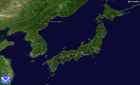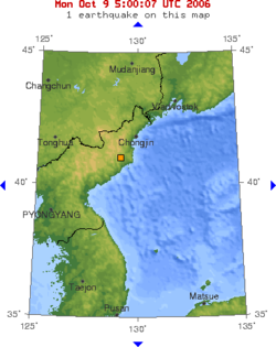 The Korea Institute of Geoscience and Mineral Resources reported seismic waves measuring 3.58 on the Richter scale.[22] The United States Geological Survey reported that a seismic event occurred at 01:35:28 UTC (10:35:28 am local time, UTC+9) on October 9, 2006 and measured 4.3 on the Richter scale. It occurred at the geographic coordinates 41°17′38.4″N 129°08′2.4″E / 41.294000°N 129.134000°E with a horizontal location uncertainty of ±9.6 km (6.0 miles). This is near Mantapsan, 73 km (45 mi) north of Kimchaek, 90 km (56 mi) southwest of Chongjin, 180 km (110 mi) south of Yanji, and 385 km (239 mi) northeast of Pyongyang.[39]