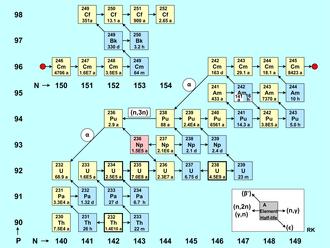 The figure buildup of actinides is a table of nuclides with the number of neutrons on the horizontal axis (isotopes) and the number of protons on the vertical axis (elements). The red dot divides the nuclides in two groups, so the figure is more compact. Each nuclide is represented by a square with the mass number of the element and its half-time.[70] Naturally existing actinide isotopes (Th, U) are marked with a bold border, alpha emitters have a yellow colour, and beta emitters have a blue colour. Pink indicates electron capture (236Np), whereas white stands for a long-lasting metastable state (242Am).