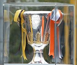 The most prestigious is the AFL premiership cup, which is presented to the captain and coach of the winning team in a ceremony after the game. The premiership cup is silver (with the exception of the 1996 cup, which was gold to commemorate the league's 100th season),[24] and is adorned with ribbons in the winning team's colours when presented. A new cup is manufactured each year by Cash's International at its metalworks in Frankston. The cup was first introduced in 1959, after league president Kenneth Luke sought to recreate the spectacle he had observed at England's FA Cup final; a lap of honour with the cup by the winning team has become customary since 1966.[25] Since 2004, it has become tradition for the cup to be presented by a past legend of the winning club, with each club's potential presenter nominated ahead of the game.[19] In 2004, the AFL allowed clubs to purchase cups based on the current design for premierships won prior to 1959.[26]