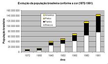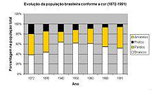In the last years, Brazil has been undergoing a process of redemption of its Black identity. This process was also reflected in national censuses. Each year the percentage of Brazilians who self-report to be non-Whites (pretos or pardos) is growing, while there is a decrease of the population that self-reports to be White. According to IBGE this is because of the "revaluation of the identity of historically discriminated ethnic groups".[37] In the social context of Brazil, where Blacks are seen as suffering higher rates of poverty, disease, crime and violence, to claim Black identity was unusual. This trend is being changed for many reasons. First of all, it was because of the direct influence of African Americans, who are seen by Brazilians as the "race victory". It was also because of the social mobility of many Black Brazilians, through education and expansion of employment opportunities. If before only the very dark Blacks would be considered pretos by Brazilian standards of race, this ethnic revaluation is now also affecting many Mulattos. Brazilians in general may be willing to affirm their European ancestry, and any person with a significant amount of European ancestry was systematically classified as White.[15] Thus, it was extremely difficult for the Mulattoes jump to the Black side of their dual nature, because they rarely wanted to be confused with the mass of poor Blacks that makes up the racial imaginary of Brazilians. . The Brazilian racism is peculiar, because the widespread miscegenation has not formed a racial democracy, due to the strong anti-Black oppression, prejudice and discrimination that it has.[38]