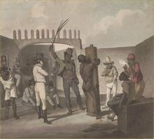 The African slaves in Brazil were known to have suffered various types of physical violence. Lashes on the back was the most common repressive measure. About 40 lashes per day were common and they prevented the mutilation of slaves.[38] The colonial chroniclers recorded the extreme violence and sadism of White women against female slaves, usually due to jealousy or to prevent a relationship between their husbands and the slaves.[36]