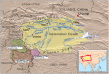 Some sources interpret Aksai to be a word of Turkic origin with the meaning "white stone desert", including several British colonial,[5][6] modern Western,[7][8][9][10] Chinese,[2][11] and Indian sources.[12][13] Some modern sources interpret it to mean "white brook" instead.[14][15] At least one source interprets Aksai to mean "eastern" in the Yarkandi Uyghur dialect.[16]