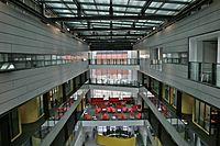 The northern two fingers are joined by an atrium, which is spanned by a series of bridges. The southernmost finger was designed to hold low vibration laboratories, and is joined by a glazed bridge at third-floor level to the middle finger.[1]