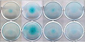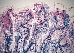 Alcian blue (/ˈælʃən/) is any member of a family of polyvalent basic dyes, of which the Alcian blue 8G (also called Ingrain blue 1, and C.I. 74240, formerly called Alcian blue 8GX from the name of a batch of an ICI product) has been historically the most common and the most reliable member.[1] It is used to stain acidic polysaccharides such as glycosaminoglycans in cartilages and other body structures, some types of mucopolysaccharides, sialylated glycocalyx of cells etc. For many of these targets it is one of the most widely used cationic dyes for both light and electron microscopy. Use of alcian blue has historically been a popular staining method in histology especially for light microscopy in paraffin embedded sections and in semithin resin sections. The tissue parts that specifically stain by this dye become blue to bluish-green after staining and are called "Alcianophilic" (comparable to "eosinophilic" or "sudanophilic"). Alcian blue staining can be combined with H&E staining, PAS staining and van Gieson staining methods. Alcian blue can be used to quantitate acidic glycans both in microspectrophotometric quantitation in solution or for staining glycoproteins in polyacrylamide gels or on western blots. Biochemists had used it to assay acid polysaccharides in urine since the 1960s for diagnosis of diseases like mucopolysaccharidosis but from 1970's, partly due to lack of availability of Alcian and partly due to length and tediousness of the procedure, alternative methods had to be developed e.g. Dimethyl methylene blue (DMB or DMMB) method.[2]