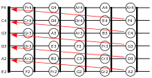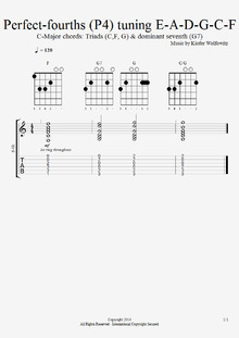 Among alternative tunings for the guitar, all-fourths tuning is a regular tuning.[1] In contrast, the standard tuning has one irregularity—a major third between the third and second strings—while having perfect fourths between the other successive strings.[2][3] The standard tuning's irregular major-third is replaced by a perfect fourth in all-fourths tuning, which has the open notes E2-A2-D3-G3-C4-F4.[1][4]