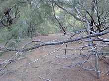 Many invasive plant species interfere with native plants through allelopathy.[19][20] A famous case of purported allelopathy is in desert shrubs. One of the most widely known early examples was Salvia leucophylla, because it was on the cover of the journal Science in 1964.[21] Bare zones around the shrubs were hypothesized to be caused by volatile terpenes emitted by the shrubs. However, like many allelopathy studies, it was based on artificial lab experiments and unwarranted extrapolations to natural ecosystems. In 1970, Science published a study where caging the shrubs to exclude rodents and birds allowed grass to grow in the bare zones.[22] A detailed history of this story can be found in Halsey 2004.[23]
