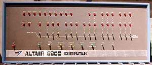 The Altair 8800 is a microcomputer designed in 1974 by MITS and based on the Intel 8080 CPU.[1] Interest grew quickly after it was featured on the cover of the January 1975 issue of Popular Electronics[2] and was sold by mail order through advertisements there, in Radio-Electronics, and in other hobbyist magazines. [3][4] The Altair is widely recognized as the spark that ignited the microcomputer revolution[5] as the first commercially successful personal computer.[6] The computer bus designed for the Altair was to become a de facto standard in the form of the S-100 bus, and the first programming language for the machine was Microsoft's founding product, Altair BASIC.[7][8]