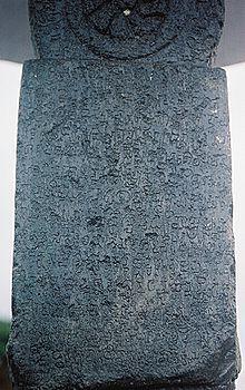 The earliest known copper plate inscription in Kannada language is attributed to Aluvarasa II, called the Belamannu plates and is dated the early 8th century, according to Dr. Gururaj Bhat.[16] This full-length Kannada copper plates in Old Kannada or Halegannada (Kannada: ಹಳೆಗನ್ನಡ) script (early 8th century CE) belongs to the Alupa King Aluvarasa II from Belmannu, Karkala Taluk, Udupi District, and displays the double crested fish, the royal emblem of Alupa kings. The records also refers to the king with the title Alupendra.