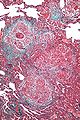High magnification micrograph of hypersensitivity pneumonitis showing granulomatous inflammation. Trichrome stain.