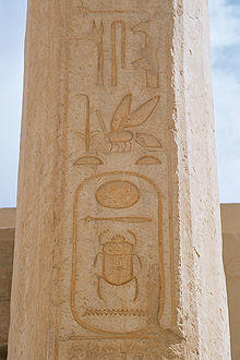 The pharaoh's throne name, the first of the two names written inside a cartouche, usually accompanied the title nsw-bity (nsw(t)-bjt(j)), traditionally interpreted as "[He] of sedge [and] bee" and often translated for convenience as "King of Upper and of Lower Egypt". (The sedge and the bee symbolised Upper and Lower Egypt, respectively,[7][8] although recent research has thrown this interpretation into doubt.[9][10])