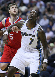 He played in 81 games during his rookie season and posted averages of 8.3 ppg, 4.8 rpg, 1.5 apg and 23.4 mpg.[10] Nocioni's physical style of defense created controversy around the league, and he was suspended for one game after a hard foul to Detroit Pistons' Tayshaun Prince.[11] Nocioni had previously committed a hard foul on the Miami Heat's Dwyane Wade and then was shoved past photographers and into the first row of spectators by Udonis Haslem. A spectator tossed a drink at Nocioni, which was similar to the incident that triggered Pacers–Pistons brawl at The Palace of Auburn Hills. The fan was ejected by security. For the incident, Nocioni received a flagrant-one foul (which is a foul involving excessive or unjustified contact) and a technical. Haslem received a technical and an ejection.[12]