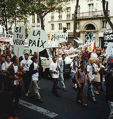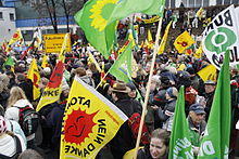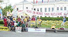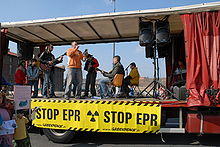 The anti-nuclear movement is a social movement that opposes various nuclear technologies. Some direct action groups, environmental movements, and professional organisations have identified themselves with the movement at the local, national, or international level.[2][3] Major anti-nuclear groups include Campaign for Nuclear Disarmament, Friends of the Earth, Greenpeace, International Physicians for the Prevention of Nuclear War, Peace Action and the Nuclear Information and Resource Service. The initial objective of the movement was nuclear disarmament, though since the late 1960s opposition has included the use of nuclear power. Many anti-nuclear groups oppose both nuclear power and nuclear weapons. The formation of green parties in the 1970s and 1980s was often a direct result of anti-nuclear politics.[4]