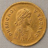 Flavius Arcadius (Greek: Ἀρκάδιος, translit. Arkádios; 1 January 377 – 1 May 408) was Roman emperor from 383 to 408. He was the eldest son of the augustus Theodosius I (r. 379–395) and his first wife Aelia Flaccilla, and the brother of Honorius (r. 393–423). Arcadius ruled the eastern half of the empire from 395, when their father died, while Honorius ruled the west. A weak ruler, his reign was dominated by a series of powerful ministers and by his wife, Aelia Eudoxia.[2]