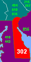 | West: 410/443/667 | Area Code 302 | East: 856, 609/640, Atlantic Ocean |