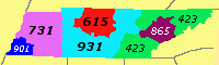 | West: 931 | The two parts of area code 423 are separated by area code 865 | East: 336, 828 |