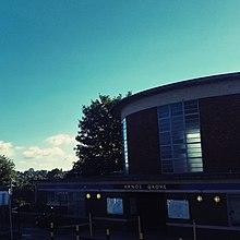 On 19 September 1932 Arnos Grove Underground station was opened, as part of the extension of the London Underground Piccadilly line to Cockfosters. In the years that followed Arnos Grove changed from a rural area to being fully developed – the part of the estate to the north of Arnos Park was, for example, built up by 1939.[4] The main public facilities at Arnos Grove were built in the 1930s. These include Arnos Pool and Bowes Road Library, both of which underwent major refurbishment in the mid-2000s, like Arnos Grove tube station.[5] The library and swimming pool, along with Arnos Park, the extensive facilities at Arnos Grove station (such as Ash House, the six sidings, and three tracks through the station with four platforms) and the proximity of Arnos Grove to the North Circular, which had been built in 1929, made Arnos Grove a desirable area to live in.
