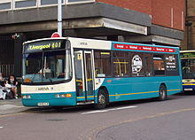 Arriva PLC is a British multinational public transport company headquartered in Sunderland, England and owned by Deutsche Bahn.[1] It was established in 1938 as T Cowie and through a number of mergers and acquisitions was rebranded Arriva in 1997 and became a subsidiary of Deutsche Bahn in 2010. Arriva operates bus, coach, train, tram and waterbus services in 14 countries across Europe. As of September 2018, it employed 61,845 people and operated 2.4 billion passenger journeys annually.[2] It operates as three divisions: UK Bus, UK Rail and Mainland Europe.[3] Deutsche Bahn announced in 2019 they wished to sell Arriva, but the sale was placed on hold as of November in that year.