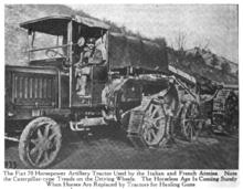 The first artillery tractors were designed prior to the outbreak of World War I, often based on agricultural machines such as the Holt tractor. Such vehicles allowed the tactical use of heavier guns to supplement the light horse drawn field guns. "Horseless artillery" available prior to World War I weighed 8 tons, had 70 horsepower and could go 8 mph.[1] For example, in the British Army it allowed the heavy guns of the Royal Garrison Artillery to be used flexibly on the battlefield.