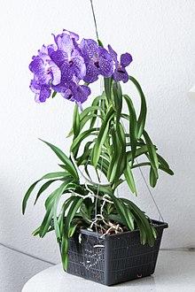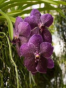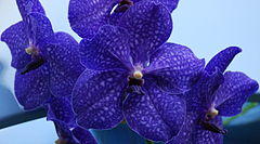 Vanda, abbreviated in the horticultural trade as V.,[2] is a genus in the orchid family, Orchidaceae. There are about 80 species, and the genus is commonly cultivated for the marketplace. This genus and its allies are considered to be among the most specifically adapted of all orchids within the Orchidaceae. The genus is highly prized in horticulture for its showy, fragrant, long-lasting, and intensely colorful flowers.[3] Vanda species are widespread across East Asia, Southeast Asia, and New Guinea, with a few species extending into Queensland and some of the islands of the western Pacific.[1][4]