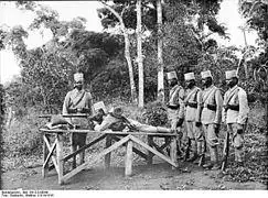 The German Colonial Army (Schutztruppe) of the German Empire employed native troops with European officers and NCOs in its colonies. The main concentration of such locally recruited troops was in German East Africa (now Tanzania), formed in 1881 after the transfer of the Wissmanntruppe (raised in 1889 to suppress the Abushiri Revolt) to German imperial control.