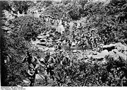 Many of the Askaris in Eritrea were drawn from local Nilotic populations, including Hamid Idris Awate, who reputedly had some Nara ancestry.[7] Of these troops, the first Eritrean battalions were raised in 1888 from Muslim and Christian volunteers, replacing an earlier Bashi-bazouk corps of irregulars. The four Indigeni battalions in existence by 1891 were incorporated into the Royal Corps of Colonial Troops that year. Expanded to eight battalions, the Eritrean ascaris fought with distinction at Serobeti, Agordat, Kassala, Coatit and Adwa[8] and subsequently served in Libya and Ethiopia.