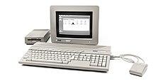 The Atari ST is a line of home computers from Atari Corporation and the successor to the Atari 8-bit family. The initial model, the 520ST, saw limited release in April–June 1985 and was widely available in July.[1][2] The 520ST is the first personal computer to come with a bitmapped color GUI,[3] using a version of Digital Research's GEM released in February 1985.[4] The 1040ST, released in 1986, is the first personal computer to ship with a megabyte of RAM in the base configuration[5] and also the first with a cost-per-kilobyte of less than US$1.[6]