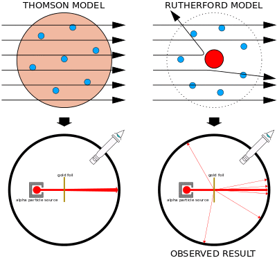 Between 1908 and 1913, Rutheford and his colleagues performed a series of experiments in which they bombarded thin foils of metal with alpha particles. They spotted alpha particles being deflected by angles greater than 90°. To explain this, Rutherford proposed that the positive charge of the atom is not distributed throughout the atom's volume as Thomson believed, but is concentrated in a tiny nucleus at the center. Only such an intense concentration of charge could produce an electric field strong enough to deflect the alpha particles as observed.[19]