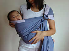 Sears advises mothers to wear infants on the body as many hours during the day as possible, for example in a sling.[43] He argues that this practice makes the child happy and allows the mother to involve the child into everything she does and never to lose sight of the child.[44] He advises working mothers to wear the child at least 4–5 hours every night in order to make good for her absence during the day.[45]
