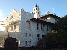 Auckland Grammar School buildings contain two Category I historic places, the school's main block and a war memorial.[8][9][10] An obelisk located in front of the school commemorates former students who fought in various wars. The school's main block, built in 1916 in the Spanish Mission style, is used for daily assemblies, exhibitions, and contains various classrooms. Surrounding the main hall in which the daily assembly is held are the school honours boards listing the names of the school's top scholars including Rhodes Scholars and Girdlers Scholars.
