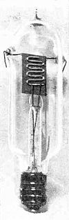 The Audion was an electronic detecting or amplifying vacuum tube[1] invented by American electrical engineer Lee de Forest in 1906.[2][3][4] It was the first triode,[1][5][6][7][8] consisting of an evacuated glass tube containing three electrodes: a heated filament, a grid, and a plate.[4] It is important in the history of technology because it was the first widely used electronic device which could amplify; a small electrical signal applied to the grid could control a larger current flowing from the filament to plate.[4][5]
