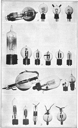 Second row (B): triodes developed at Western Electric which bought the rights from De Forest in 1913. These were used in telephone repeaters which made possible the first transcontinental telephone line in 1915.