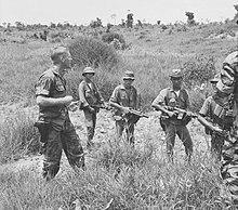 The Australian Army Training Team Vietnam (AATTV) was raised in 1962 and initially consisted of approximately 30 officers and warrant officers and was tasked to train and advise units of the Army of the Republic of Vietnam (ARVN) as part of the existing US advisory effort controlled by Military Assistance Advisory Group (MAAG), and later United States Military Assistance Command Vietnam (MACV).[2][3] Most of the advisors were career officers and senior NCOs, with the majority from the infantry, SAS or Commandos, although there were a number of signalers, engineers and other specialist corps represented. They were hand picked for the task and were considered experts in counter-revolutionary warfare and jungle operations, with many having served in the Malayan Emergency.[4] Due to the nature of service as a combat advisor personnel serving with the AATTV were all mature and experienced soldiers, with an average age of 35.[4]