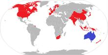 Australian rules football was played outside Australasia as early as 1888 when Australians studying at Edinburgh University and London University formed teams and competed in London.[86] Today, the sport is played at an amateur level in various countries throughout the world. Twenty countries participated in the Euro Cup and 23 countries have participated in the International Cup with both competitions prohibiting Australian players. Over 20 countries have either affiliation or working agreements with the AFL.[87] There have been many VFL/AFL players who were born outside Australia, an increasing number of which have been recruited through initiatives and, more recently, international scholarship programs.