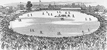 The game around this time was defensive and low-scoring, played low to the ground in congested rugby-style scrimmages. The typical match was a 20-per-side affair, played with a ball that was roughly spherical, and lasted until a team scored two goals.[28] The shape of the playing field was not standardised; matches often took place in rough, tree-spotted public parks, most notably the Richmond Paddock (Yarra Park), known colloquially as the Melbourne Football Ground.[39] Wills argued that the turf of cricket fields would benefit from being trampled upon by footballers in winter,[40] and, as early as 1859, football was allowed on the MCG.[41] However, cricket authorities frequently prohibited football on their grounds until the 1870s, when they saw an opportunity to capitalise on the sport's growing popularity. Football gradually adapted to an oval-shaped field, and most grounds in Victoria expanded to accommodate the dual purpose—a situation that continues to this day.[41]