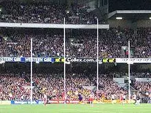 As clubs began touring the colonies in the late 1870s, the sport spread to New South Wales, and in 1879, the first intercolonial match took place in Melbourne between Victoria and South Australia.[46] In order to standardise the sport across Australia, delegates representing the football associations of South Australia, Tasmania, Victoria and Queensland met in 1883 and updated the code.[44] New rules such as holding the ball led to a "golden era" of fast, long-kicking and high-marking football in the 1880s, a time which also saw the rise of professionalism, particularly in Victoria and Western Australia (where the code took hold during the colony's gold rushes), and players such as George Coulthard achieve superstardom.[47] Now known as Australasian rules or Australian rules, it became the first football code to develop mass spectator appeal,[46] attracting world record attendances for sports viewing and gaining a reputation as "the people's game".[47]