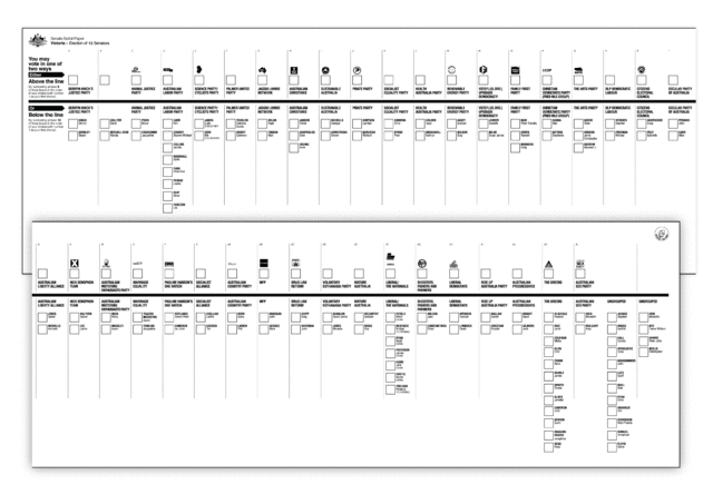 In 2016, group tickets were abolished to avoid undue influence of preference deals amongst parties that were seen as distorting election results[7] and a form of optional preferential voting was introduced. As a result of the changes, voters may assign their preferences for parties above the line (numbering as many boxes as they wish), or individual candidates below the line, and are not required to fill all of the boxes. Both above and below the line voting now use optional preferential voting. For above the line, voters are instructed to number at least their first six preferences; however, a "savings provision" is in place to ensure that ballots will still be counted if less than six are given. For below the line, voters are required to number at least their first 12 preferences. Voters are free to continue numbering as many preferences as they like beyond the minimum number specified. Another savings provision allows ballot papers with at least 6 below the line preferences to be formal. The voting changes make it more difficult for new small parties and independent candidates to be elected to the Senate, but also allow a voter to voluntarily "exhaust" preferences — that is, to ensure their vote cannot flow to specific candidates or parties — in the event that none of the voter's candidates preferences are elected.[8]