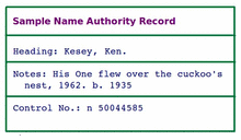 - ^ "Authorities files". Library of Congress.; the original record has been abbreviated for clarity.